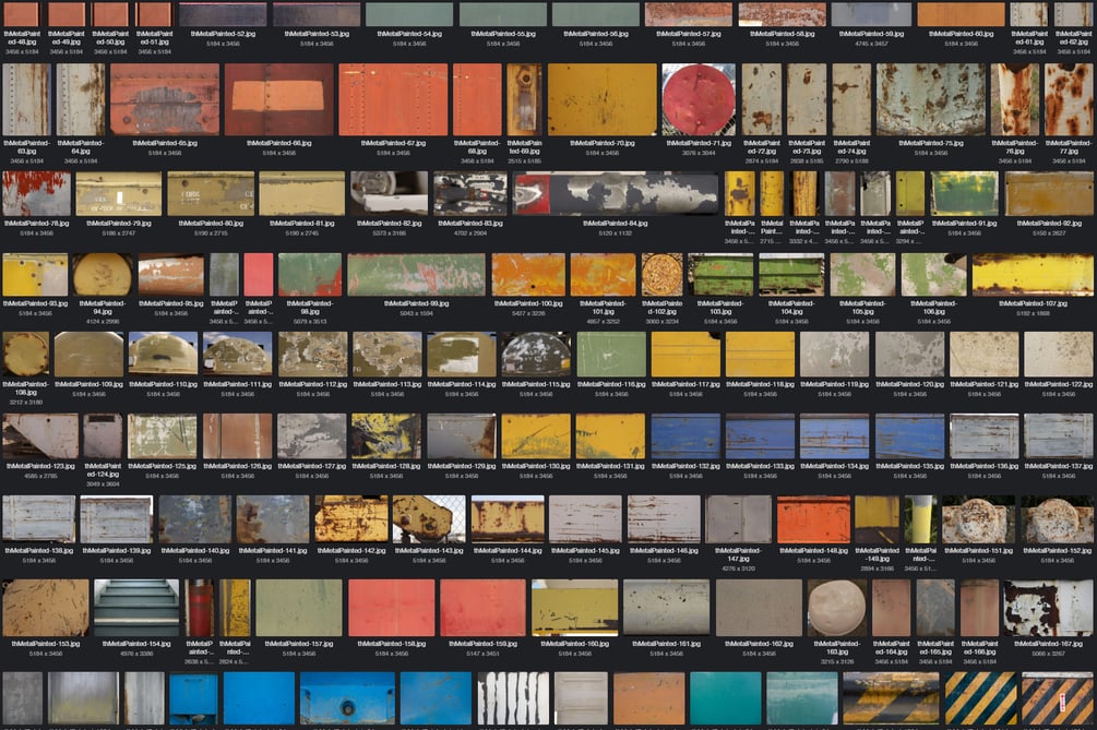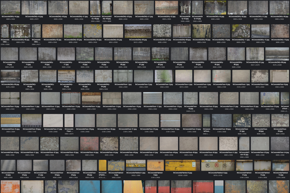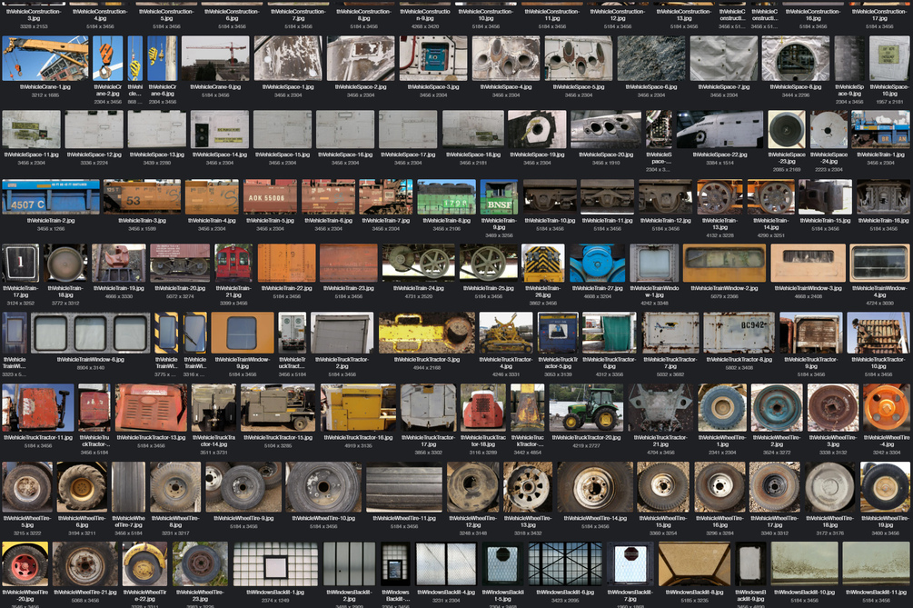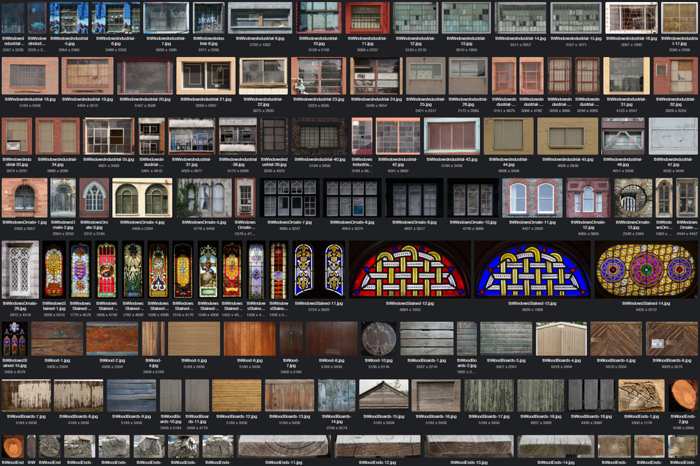 These images used to be offered as individual downloads at texturehunt.com. For the most part, I just added images there as they were captured and categorized, without any editing or corrections. The quality of this collection has improved over time with hours spent correcting exposure, color, noise, and perspective, but the images will probably still need some processing depending on how you plan to use them.